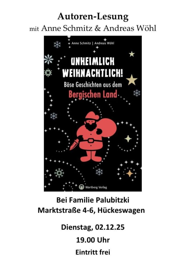 Vom 26.11. bis 16.12.22 haben Anne Schmitz und ich ein etwas anderes Weihnachtsfeeling im Oberbergischen verbreitet. Auf unseren Lesungen in Engelskirchen-Loope, Lindlar, Wipperfürth, Hückeswagen und Wipperfürth-Thier gab es kriminelles, humoriges und unheimliches für das Publikum. Eine ganz tolle Lesereise und Erfahrung, die uns und sichtlich auch den Zuhörenden sehr viel Spaß gemacht hat.
