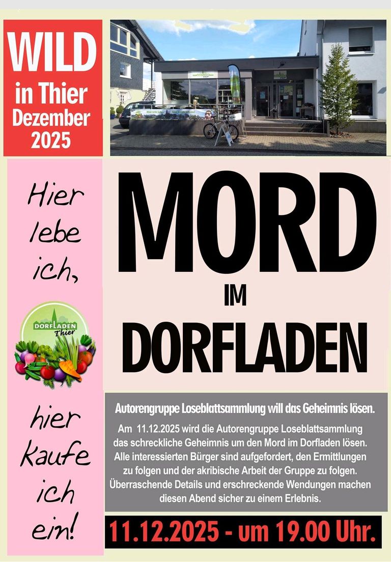 Diesen Dorfkrimi hat unsere Autorengruppe Loseblattsammlung eigens für die Lesung im Dorfladen Thier geschrieben. Wir sind dort immer wieder gern zu Gast und schätzen die heimelige Atmosphäre und die Nähe zum Publikum.